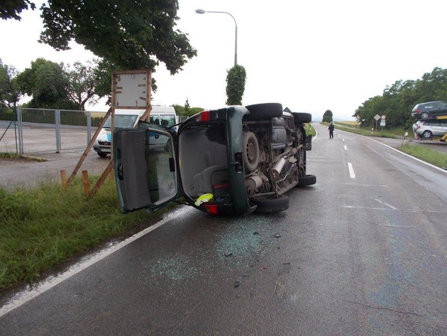 12. Juni 2018, 12.10 Uhr Am Dienstagmittag ereignete sich auf der Landstraße zwischen Herxheim und Offenbach ein spektakulärer Unfall, der jedoch glimpflich ausging. Der Fahrer eines Autotransportes wollte am Ortsausgang von Herxheim nach rechts von der Fahrbahn abbiegen. Er betätigte hierzu den Blinker. Der Fahrer des nachfolgenden Pkw Ford Galaxy setzte in diesem Moment zum Überholen an. Als sich der Fahrer des Fords, ein 81-jähriger Mann aus dem Raum Germersheim auf gleicher Höhe mit dem Sattelauflieger befand, schwenkte der Anhänger bauartbedingt aus und warf den Pkw um. Der Pkw blieb auf der Fahrerseite liegen (siehe Bild). Dabei erlitt der ältere Mann leichte Hautabschürfungen an der Hand. An seinem Auto entstand ein Totalschaden und es musste abgeschleppt werden. Am Anhänger des Lkws wurde die Beleuchtungseinrichtung beschädigt. Da bei dem Unfall Betriebsstoffe auf die Straße liefen musste die Fahrbahn durch die Straßenmeisterei gereinigt werden. Es kam zu geringfügigen Verkehrsbehinderungen.