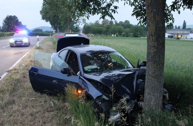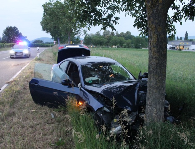 14. Juni 2018, 5 Uhr Ein 20-jähriger BMW-Fahrer befuhr am Donnerstagmorgen die Landstraße 493 zwischen Billigheim und Ingenheim als ihm plötzlich schwarz vor Augen wurde. Er kam von der Fahrbahn ab, streifte einen Baum und fuhr am nächsten Baum frontal auf (siehe Bild). Die Airbags im Auto lösten aus. Am BMW entstand ein Totalschaden und er musste abgeschleppt werden. Der Fahrer erlitt durch den Anstoß Prellungen und Schnittverletzungen am Bein und Gesicht. Auch sein Beifahrer verletzte sich leicht und klagte über Prellungen am Hals und an der Schulter.