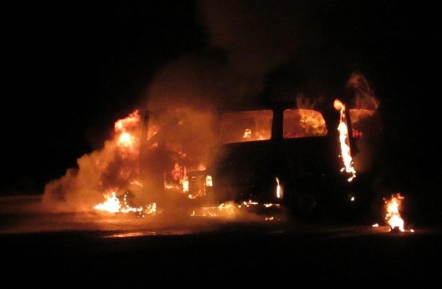 Heute Morgen, gegen 06.28 Uhr brannte in der Bahnhofstraße ein Mercedes Vito völlig aus, nachdem dieser kurz zuvor geführt wurde, um Mitarbeiter einer Firma aus Ludwigshafen in einer nahe gelegenen Firma in der Bahnhofstraße abzusetzen. Glücklicherweise begann das ursprünglich fast voll besetzte Fahrzeug erst an zu brennen, nachdem der Fahrer und seine fünf Mitfahrer das Fahrzeug verlassen hatten. Die Feuerwehr hatte den Brand gelöscht. Nach bisherigen Erkenntnissen ist von einem technischen Defekt auszugehen. Der Sachschaden beträgt ca. 30000,-EUR.