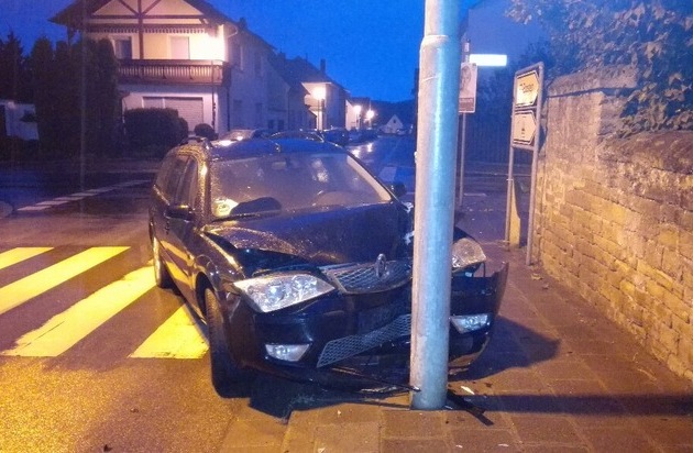 Vor Ort kann der stark beschädigte Ford mit Frankenthaler Kennzeichen aufgefunden werden. Da der Motorraum stark qualmte, wurde die Feuerwehr hinzugezogen. Augenscheinlich war der Fahrer von der Sonnenstraße nach rechts in Richtung Eppstein abgebogen und dabei ungebremst gegen den Mast gefahren. Dabei entstand Sachschaden von ca. 6000 EUR.
