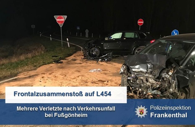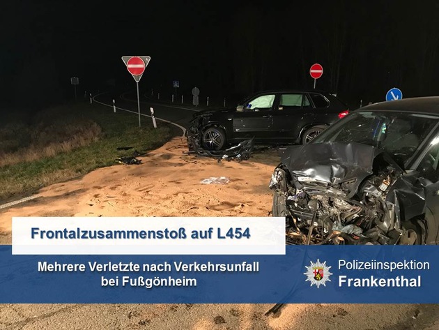 Am 28.01.2018 kommt es gegen 18:00 Uhr zu einem schweren Verkehrsunfall auf der L454 bei Fußgönheim, auf Höhe der Einmündung zur A 650. Nach derzeitigem Stand der Ermittlungen übersieht die 40-jährige Fahrerin eines Opel Meriva beim Linksabbiegen zur Auffahrt zur A650 einen entgegenkommenden BMW X7, so dass es zum Frontalzusammenstoß der beiden Fahrzeuge kommt. Der 55-jährige Fahrer des BMW und sein 11-jähriger Sohn werden zur ambulanten Behandlung in eine nahegelegene Klinik eingeliefert. Die Fahrerin des Opels und deren 10 und 19 Jahre alten Töchter erleiden schwerere Verletzungen und werden zur weiteren Behandlung in umliegende Krankenhäuser eingeliefert. Akute Lebensgefahr besteht nach derzeitigem Stand glücklicherweise bei keinem der Unfallbeteiligten. Zur Untersuchung des genauen Unfallhergangs wird seitens der Staatsanwaltschaft Frankenthal ein Gutachterbüro beauftragt. Während der Unfallaufnahme wird die L 454 in diesem Bereich und der Zu- und Abfahrtsbereich zur A 650 vollgesperrt. Die Feuerwehr Fußgönheim ist mit mehreren Einsatzfahrzeugen ebenfalls im Einsatz gewesen. Beide Fahrzeuge erleiden einen Totalschaden und sind nicht mehr fahrbereit. Der Gesamtschaden dürfte sich auf mindestens 45.000 EUR belaufen.