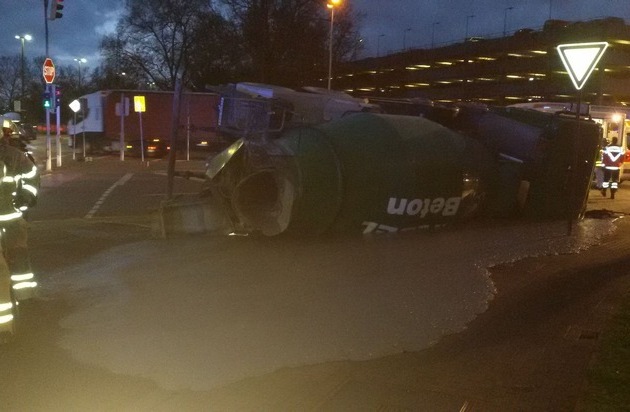 Am Mittwoch, den 13.01.2016, gegen 17:00 Uhr, kam es im Bereich der Brunckstraße zu einem Verkehrsunfall. Beim Abbiegevorgang nach links von der Brunckstraße auf die Ammoniakstraße in Fahrtrichtung Tor 11 der BASF kippte aus bislang ungeklärter Ursache ein Betonmischer um. Hierbei traten insgesamt ca. 4 Kubikmeter flüssige Betonmasse aus. Diese ergoss sich hierbei über die Abbiegerspur. Zu größeren Verkehrsbeeinträchtigungen kam es nicht. Bei dem Verkehrsunfall wurden sowohl der 40-jährige Fahrer als auch der 56-jährige Beifahrer leicht verletzt. Der Beifahrer wurde zur weiteren medizinischen Behandlung in die Berufsgenossenschaftliche Unfallklinik verbracht. Die Bergungs- sowie Säuberungsmaßnahmen seitens der Berufsfeuerwehr Ludwigshafen sowie der Werksfeuerwehr der BASF dauern zur Stunde noch an. Die Schadenssumme dürfte sich auf ca. 15.000 EUR belaufen.
