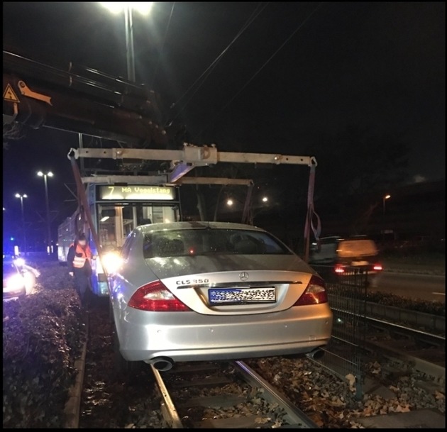 Endstation Gleise. So lautete die letzte Fahrt eines Mercedes, der am frühen Freitagmorgen (03.02.17) auf ein Gleisbett in der Brunkstraße landete. Der Mercedes-Fahrer fuhr gegen 05.45 Uhr auf der Sternstraße in Richtung Kreuzungsbereich Brunkstraße/Sternstraße. Unmittelbar vor dem Kreuzungsbereich wollte er verbotswidrig links in die Brunkstraße abbiegen, obwohl nur ein Rechtsabbiegen erlaubt war. Dieser Abkürzungsversuch ging schief. Denn zu diesem Zeitpunkt kam ihm ein anderer Pkw entgegen, dem er ausweichen musste. Dadurch kam der Mercedes-Fahrer von der Fahrbahn ab, fuhr auf die parallel zur Brunkstraße verlaufenden Schienen und setzte sich dort fest. Während der Bergung des Mercedes kam der Schienenverkehr der Linie 7 für eineinhalb Stunden zum Erliegen. An dem festsitzenden Mercedes entstand ein Schaden von 1500 Euro. Zu einer Kollision mit einer Straßenbahn kam es nicht.