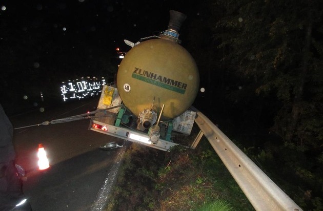 Am Montag, 12. Oktober 2015, fuhr gegen 20.30 Uhr ein landwirtschaftlicher Schlepper mit anhängendem gefülltem Güllefass die B421/Zeller Berg in Richtung Tellig. Kurz vor der Abzweigung zur Mülldeponie wurde das Gespann durch einen Sattelzug überholt. Bedingt durch Gegenverkehr zog der Sattelzug nach rechts. Um einen Zusammenstoß mit diesem zu vermeiden, wich der landwirtschaftliche Zug nach rechts aus und kam hierbei auf den unbefestigten Randstreifen. Aufgrund ihres Gewichtes blieben Schlepper und Anhänger stecken und drohten umzukippen. Der Fahrer des Sattelzuges setzte seine Fahrt fort, ohne sich um den entstandenen Schaden zu kümmern. Zwecks Sicherung und weiterer Maßnahmen wurde die Feuerwehr verständigt. Im Einsatz war anschließend ein Großaufgebot der Wehren aus Zell, Briedel und Blankerath. Die B421 musste hierzu für ca. 1,5 Stunden für den Verkehr komplett gesperrt werden. Von dem Sattelzug ist nur bekannt, dass der Auflieger vermutlich eine dunkle Plane hatte. Angaben zu dem entgegenkommendem Fahrzeug konnten ebenfalls nicht erlangt werden. Hinweise bzgl. der beiden Fahrzeuge bitte an die Polizei Zell, Tel. 06542/98670, oder pizell@polizei.rlp.de