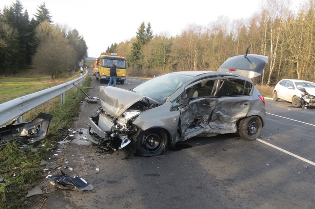 Am 28. Januar 2016, gg. 14.50 Uhr, befuhr ein 79-jähriger Pkw-Fahrer mit einer 72-jährigen Beifahrerin, beide aus der VG Oberen Kyll, die L23 aus Richtung Olzheim kommend und wollte an der Einmündung B265 nach links in Richtung Prüm fahren. Ein ebenfalls aus der VG Oberen Kyll stammender 18-jähriger Pkw-Fahrer befuhr die B265 aus Richtung Prüm kommend in Richtung Losheim. Zum Zusammenstoß der beiden Fahrzeuge kam es, als der 79-jährige Fahrer den aus Richtung Prüm kommenden Pkw übersieht und dessen Vorfahrt mißachtet. Der 79-jährige Fahrer und seine Beifahrerin wurden schwerverletzt ins Krankenhaus Prüm eingeliefert. Der 18-jährige Fahrer wurde leichtverletzt. An beiden Pkw entstand Totalschaden.