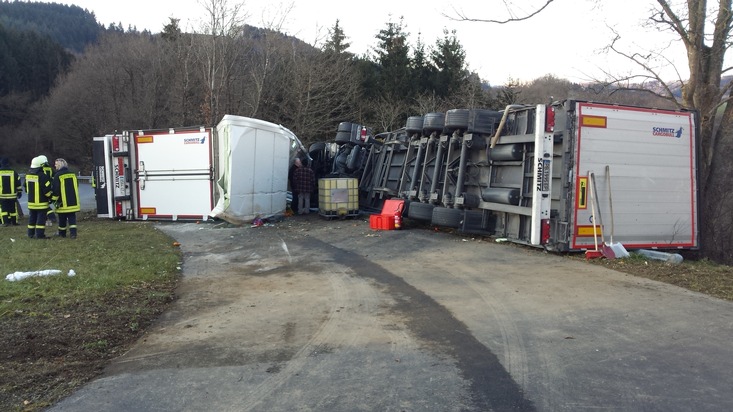Der Fahrer eines mit Obst und Gemüse beladenen spanischen Sattelzugs befuhr am Montag, 07. März 2016, gegen 15.40 Uhr, die B410 aus Richtung Daleiden kommend in Richtung Irrhausen. Auf der Gefällstrecke geriet er in einer langgezogenen scharfen Linkskurve, vermutlich infolge nicht angepasster Geschwindigkeit, nach rechts von der Fahrbahn und kippte auf einem parallel laufenden Parkplatz um. Hiernach prallte er gegen den haltenden Sattelzug eines bulgarischen Fahrers, welcher u.a. Sekt und Wein geladen hatte. Durch den Aufprall verteilte sich die Ladung der beiden Fahrzeuge auf dem Parkplatzgelände bzw. dem angrenzenden Hang einer Wiese. Der spanische Fahrer musste von der Feuerwehr aus dem Fahrzeug befreit werden und wurde schwerverletzt mittels Rettungshubschrauber in ein Krankenhaus verbracht. Der bulgarische Fahrer wurde leichtverletzt und durch das DRK in ein umliegendes Krankenhaus verbracht. Nach ersten Schätzungen dürfte ein Gesamtschaden von etwa 200.000 EUR entstanden sein. Im Einsatz waren die Feuerwehren Arzfeld, Daleiden und Prüm, das DRK Arzfeld sowie Rettungshubschrauber Christoph 10.