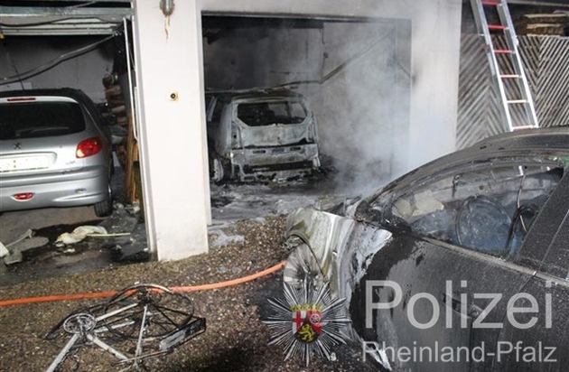 Gegen 1.20 Uhr hatte ein Anwohner der Straße "Im Busental" das Feuer bemerkt und die Feuerwehr alarmiert. Die konnte das Feuer schnell löschen. Dennoch entstand ein beträchtlicher Sachschaden. Nach den bisherigen Ermittlungen der Polizei war das Feuer in einem PKW ausgebrochen, der in einer der Garagen der Garagenanlage stand. Das Garagentor war nicht verschlossen. Dieser Kleinwagen brannte völlig aus. Ein vor dieser Garage geparkter PKW wurde stark beschädigt. Von der Garage griff das Feuer auf die daneben liegende Garage über, in der ein dritter PKW beschädigt wurde. Insgesamt dürfte ein Schaden von etwa 50.000 Euro entstanden sein. Brandermittler der Trierer Kripo werden den Brandort heute untersuchen. Die kriminalpolizeilichen Ermittlungen werden wegen Verdachts der vorsätzlichen Brandstiftung geführt.