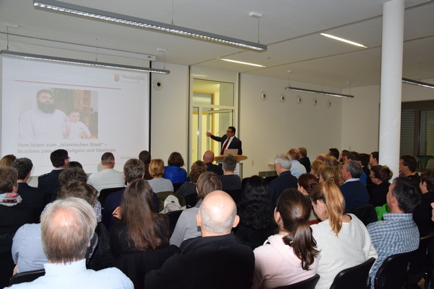 Mit dem 1. Impulsreferat "Vom Islam zum Islamischen Staat - Muslime zwischen Religion und Ideologie" eröffnete Herr Aladdin Sarhan, Islamwissenschaftler des LKA Rheinland-Pfalz, die Veranstaltung. In seinem wissenschaftlich fundierten - mit persönlichen und emotionalen Akzenten gefärbten - Vortrag erläuterte Herr Sarhan zunächst die Begriffsbestimmungen und die Kernelemente von Islam und Islamismus und endete mit dem Thema "Salafismus".