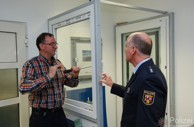 Einmal bei der Polizei einbrechen dürfen: Das beigefügte Foto zeigt einen Besucher, der im Beisein von Polizeihauptkommissar Michael Lui, das Fenster am "Prüfstand" aufhebeln durfte.