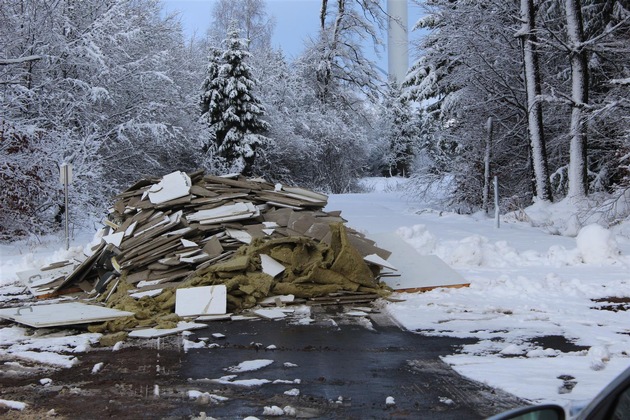 Zwischen Freitag, 15. Dezember 2017 und Samstag, 16. Dezember 2017, kam es zu einer illegalen Müllentsorgung in Stadtkyll, Ortsteil Schönfeld. Eine bislang unbekannte Person entlud auf einer Zufahrt zum dortigen Windpark ca. 5-6 Kubikmeter Bauschutt in Form von Dämmwolle und Rigipsplatten. Auffällig dabei waren Türen, die an der Seite des Bauschutts angebracht waren. Diese dienten vermutlich als Seitenwände auf dem Anhänger.