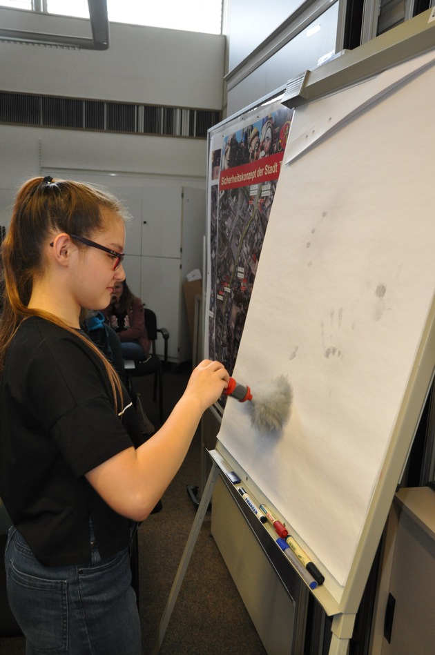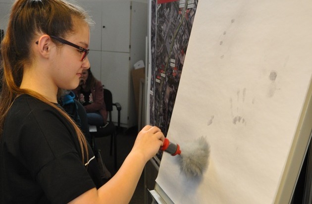 Neben Fragen nach den Einstellungsvoraussetzungen, um sich bei der Polizei bewerben zu können interessierten sich die Mädchen vor allem für den Alltag einer Polizeibeamtin. So stellten wir ihnen die grundlegende Polizeiarbeit vor, die sich nicht nur auf Strafverfolgung bezieht, sondern bei der die Gefahrenabwehr oft eine entscheidende Rolle spielt. Wie läuft die Arbeit an einem Wachtisch ab? Welche Informationen braucht die Polizei, wenn ein Notruf eingeht? Wie fühlt man sich in einer Gewahrsamszelle? Diese Fragen erklärten sich bei dem Besuch der Wachen schnell von selbst. Spannend war auch, wie man sich mit Polizeiausrüstung fühlt. Die Mädchen durften darum Schutzwesten, Handschellen, Einsatzgürtel und Funkgerät anziehen und ausprobieren. Dass beim Selbsttest des Alkoholmessgerätes keine Auffälligkeiten festgestellt wurden, versteht sich von selbst. Am spannendsten fanden die Teilnehmerinnen zum einen die erkennungsdienstliche Behandlung, bei der sie auf Wunsch fotografiert werden konnten und ihre Fingerabdrücke genommen wurden oder selbst versuchten, Fingerabdruckspuren zu sichern. Zum anderen war die Laserpistole ein Highlight für viele Mädchen - sie konnten selbst ein fahrendes oder stehendes Auto lasern und den Unterschied feststellen. Für die hierbei gemessenen Verkehrsteilnehmer gilt: Keine Angst, das Lasern diente nur Übungszwecken - ein Bußgeldverfahren wird nicht eingeleitet;-)