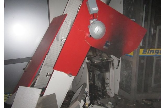 Die Polizei Worms wurde am frühen Donnerstagmorgen, gegen kurz vor halb vier, über eine Alarmauslösung an einem Geldautomaten informiert. Vor Ort in Monsheim fanden die Beamten ein Bild der Verwüstung vor. Der Vorraum eines Supermarktes, in dem der Automat platziert war, wurde völlig zerstört. Die Scheiben waren eingeschlagen und die komplette Decke hing herunter. Als die Polizisten den Raum betreten wollten, fanden sie den Geldautomaten in Einzelteilen verstreut vor. Der Rest des Automaten stand in Flammen, konnte aber durch Kräfte der Feuerwehr gelöscht werden. Nach ersten Erkenntnissen wird davon ausgegangen, dass unbekannte Täter in den Markt eingebrochen sind und dann den Automaten auf noch unbekannte Weise gesprengt haben. Ob das darin befindliche Geld entwendet wurde, steht noch nicht fest. Die Höhe des Sachschadens dürfte nach ersten Schätzungen mehrere zehntausend Euro betragen. Hinweise nimmt die Polizei Worms unter der Rufnummer 06241-8520 entgegen.