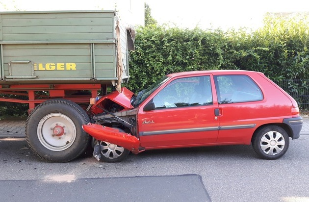 Ein 18-jähriger Mann wurde bei einem Verkehrsunfall schwer verletzt, als er am Mittwoch gegen 06.30 Uhr die Höhenstraße in Osthofen in absteigende Richtung befuhr. Aufgrund der tiefstehenden Sonne war der Osthofener dermaßen geblendet, dass er den vor ihm auf der Straße abgestellten Auflieger eines Traktors nicht wahrnahm und ungebremst auf diesen auffuhr. Er erlitt schwere Verletzungen in Form von Prellungen am Oberkörper und an der Wirbelsäule. Am PKW entstand wirtschaftlicher Totalschaden. Die hintere Achse sowie die Bremseinrichtung des landwirtschaftlichen Anhängers wurden beschädigt, hier wird der Schaden auf circa 2500 Euro beziffert.