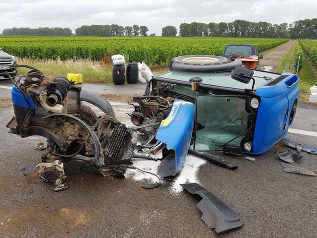Am 01.07.2017 gegen 10:30 Uhr befährt der 55-jährige LKW-Führer mit seinem Fahrzeug die B9 aus Richtung Guntersblum kommend in Richtung Worms. Ein 42-jähriger Führer eines Traktors befährt die B9 in gleiche Richtung. Kurz nach der Anschlussstelle Alsheim überholt der 55-jährige Mann mit bulgarischer Staatsangehörigkeit den Traktor. Aus bislang ungeklärter Ursache kommt es bei dem Überholvorgang zum seitlichen Zusammenstoß des Traktors mit dem LKW. Der Traktor gerät durch den Unfall ins Schleudern, kippt auf die Seite und bricht in mehrere Teile auseinander. Weiterhin tritt Betriebsstoff in größerer Menge aus. Der 42-jährige, litauische Führer des Traktors erleidet einen Schock und diverse Schürfwunden. Zur Abklärung weiterer Verletzungen und Beobachtung des Gesundheitszustandes wird er stationär in ein Krankenhaus eingeliefert. Zur Bergung der Fahrzeuge und Reinigung der Fahrbahn wird die B9 in beide Fahrtrichtungen bis ca. 13 Uhr voll gesperrt.