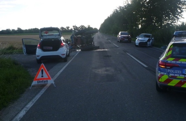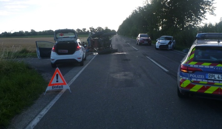 Die 35 jährige PKW-Fahrerin überholte am 22.06.2018 gegen 07:08 Uhr auf der L440 zwischen Eich und Gernsheimer Fähre einen vorausfahrenden Traktor, als dieser unvermittelt nach links ausscherte um in einen angrenzenden Feldweg einzubiegen und gegen den auf gleicher Höhe befindlichen PKW stieß. Der Ford Fiesta drehte sich durch den Zusammenstoß und kam entgegen der Fahrtrichtung zum Stehen. Der Traktor kippte zur Seite um, wobei der 33 jährige Fahrer aus der Fahrerkabine fiel. Der Traktorfahrer zog sich polytraumatische Verletzungen zu und musste mittels Rettungshubschrauber in ein nahes Krankenhaus verbracht werden. Die PKW-Fahrerin erlitt einen Schock und diverse Prellungen am Oberkörper. Die L440 musste während der Verkehrsunfallaufnahme für vier Stunden voll gesperrt werden. Die Fähre stellte den Betrieb für mehrere Stunden ein.