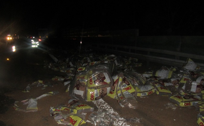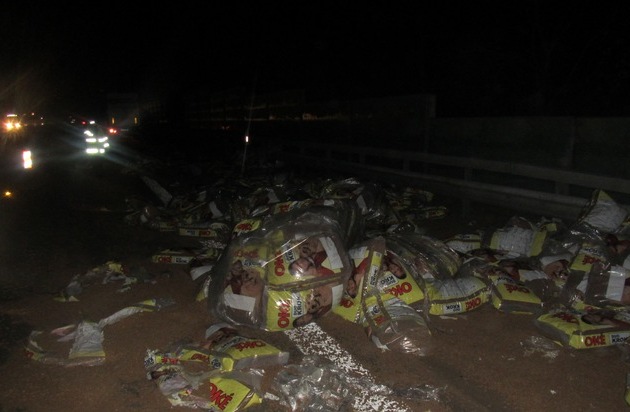 POL-VDMZ: Sattelzug kommt von Autobahn ab - Hundefutter auf der Autobahn