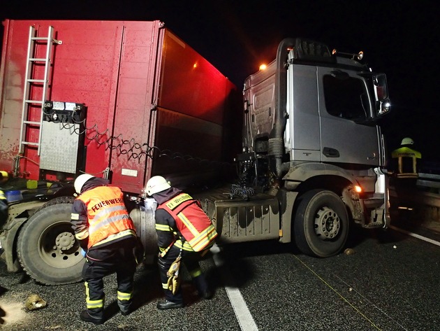 Ein Unfall zwischen zwei Lkw führte gegen 00.30 Uhr auf der A61 zu Verkehrsbehinderungen. Ein mit Stückgut beladener holländischer Sattelzug hatte einen Rübenlaster in Richtung Ludwigshafen überholen wollen als dieser plötzlich nach rechts von der Fahrbahn abkam. Die 25-jährige Fahrerin versuchte noch eine Kollision mit den Leitplanken zu verhindern und lenkte heftig nach links, stieß dabei aber gegen den Holländer. Durch den Aufprall wurde der so heftig ebenfalls nach links gedrückt, dass er die Mittelleitplanken bis weit in die Gegenfahrbahn hinein verbog. Die Bordwand des Rübenlasters aus dem Raum Friedberg hielt dem Druck nicht stand, so dass sich die Ladung auf alle Fahrstreifen in beide Richtungen verteilte. Umherfliegende Fahrzeugteile beschädigten noch einen entgegenkommenden Pkw eines 41-Jährigen aus Viersen. Nachdem der Rübenlaster quer zur Fahrbahn zum Stehen kam, liefen auch noch 200 Liter Diesel aus dem Tank ins Erdreich der angrenzenden Böschung.