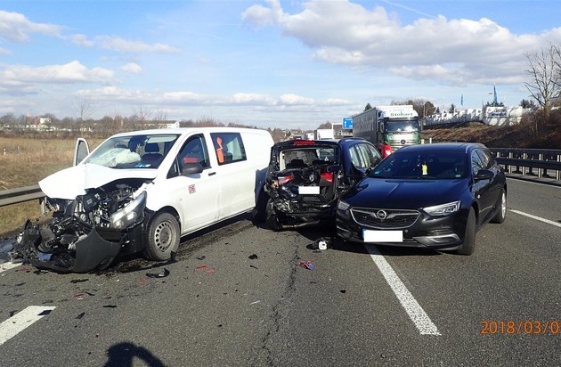 Am Montag, dem 05.03.2018 gegen 15:05 Uhr ereignete sich auf der BAB 60 FR Bingen zwischen dem Tunnel Mainz-Hechtsheim und der AS Hechtsheim- West ein Verkehrsunfall mit Personenschaden. Es herrschte stockender Verkehr im alltäglichen Berufsverkehr. Ein 58-jähriger Fahrer aus dem Bereich Brandenburg bemerkte das Abbremsen der vorausfahrenden Fahrzeuge zu spät und fuhr mit erheblicher Geschwindigkeit mit seinem Mercedes- Vito auf den vor ihm fahrenden VW Touran. Dieser wurde durch den starken Aufprall auf einen weiteren PKW geschoben. Die Airbags wurden an zwei Fahrzeugen ausgelöst, es liefen Betriebsstoffe aus und auf der Autobahn herrschte ein Trümmerfeld. Der 62-jährige Fahrer des VW Tourans wurde bei dem Verkehrsunfall schwer verletzt. Der Unfallveruracher wurde mit leichten Verletzungen ebenfalls ins Krankenhaus verbracht. Der mittlere- und der rechte Fahrstreifen mussten während der Bergungsarbeiten und der Fahrbahnreinigung bis 17:00 Uhr gesperrt werden. Der Verkehr konnte über den linken Fahrstreifen an der Unfallstelle vorbeifließen. Die Gesamtschadenshöhe beträgt ca. 55000EUR.