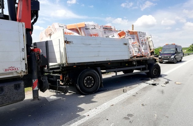 Ein Moment der Unaufmerksamkeit war Ursache für einen Verkehrsunfall auf der A61. Zunächst war gegen 12.40 Uhr ein Lastzug aus Langenlohnsheim mit einer Reifenpanne bei Gundheim in Fahrtrichtung Ludwigshafen liegen geblieben. Der 60-jährige Fahrer eines weiteren Lastzuges aus Budenheim übersah den Havaristen auf dem Standstreifen und fuhr so dicht an ihm vorbei, dass sein Außenspiegel dabei abgerissen wurde. Durch den Aufprall erschrockenen versuchte er noch ein Ausweichmanöver, das aber zu einer Kollision der beiden Anhänger führte. Weil die Achsen eines Anhängers dabei brachen, gestaltete sich die Bergung sehr aufwändig. Die aus 11t Porotonsteinen bestehende Ladung musste zunächst umgeladen werden. Die Arbeiten dauern noch an, der rechte Fahrstreifen ist gesperrt. Verletzt wurde niemand. Es entstand Sachschaden in Höhe von 52.000 Euro. Der 52-jährige Fahrer des Langenlohnsheimer Lkw wird sich auch noch einen Vorwurf gefallen lassen müssen. Er hatte es versäumt, seinen liegengebliebenen Lastzug mit einem Warndreieck abzusichern.
