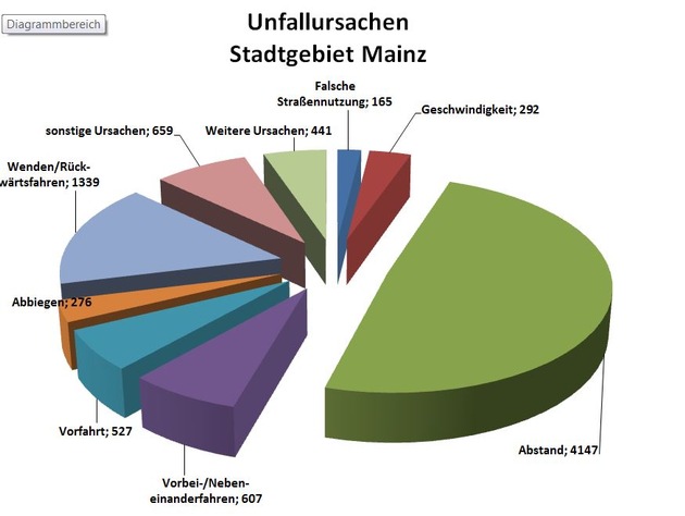 Im Jahr 2016 kam im Stadtgebiet Mainz zu insgesamt 75 Unfällen, bei denen Alkohol (mit-)ursächlich war. Dabei wurden insgesamt 29 Personen verletzt. Im Jahresvergleich sind die Zahlen gesunken. Möglicherweise liegt das daran, dass die Mainzer Polizei sehr konsequent in den letzten Jahren Alkohol- und Drogenkontrollstellen eingerichtet hat und auch an Schulen, Fahrschulen und auf Veranstaltungen insbesondere die Risikogruppe Junge Fahrer aufgeklärt hat. Aber auch die strengere Gesetzgebung - Alkoholverbot für Fahranfänger (0,00 Promille) - und das begleitete Fahren dürften dazu beigetragen haben, dass die jungen Leute in der Probezeit vorsichtig geworden sind.