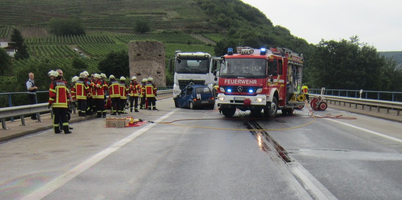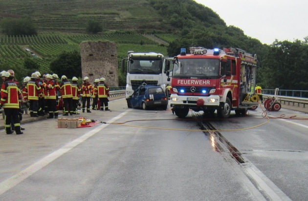 Bei einem Frontalzusammenstoß zwischen einem PKW und einem LKW wurde ein 57-jähriger Binger tödlich verletzt. Nach ersten Ermittlungen befuhr der 57-Jährige mit seinem Fiat die Bundestraße 9 aus Richtung Mainz kommend in Richtung Bingerbrück. In Höhe der Gleis- und Bundesstraßenüberführung B 48 kam der Fahrer nach rechts von der Fahrbahn ab und kollidierte dort mit der Leitplanke. Das Fahrzeug fuhr dann auf die Gegenfahrbahn, zwei entgegenkommende Fahrzeuge konnten noch ausweichen, danach kam es zur Kollision mit einem LKW. Hierbei wurde der Pkw unter die Fahrzeugfront des Lkw geschoben, das Fahrzeug sowie dessen Fahrer mussten im weiteren Verlauf von der Feuerwehr Bingen geborgen werden. Der 59-jährigen LKW-Fahrer aus Ingelheim wurde bei dem Unfall nicht verletzt. Zur Klärung der Unfallursache wurde ein Gutachter hinzugezogen. Die Strecke musste zur Unfallaufnahme komplett gesperrt werden.
