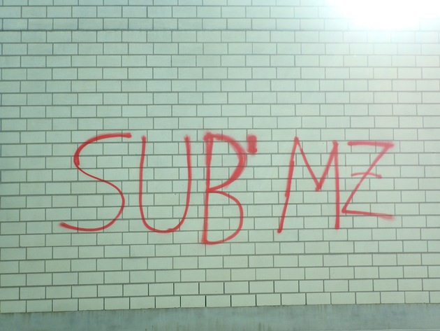 Ein Anwohner der Pfarrer-Stockheimer-Straße in Mainz Bretzenheim meldete am Mittwochmorgen ein Graffito an seinem Holzgaragentor. Unbekannte Täter beschmierten das Garagentor mit weißer Farbe mit dem Schriftzug "USM". Noch während der Anzeigenaufnahme vor Ort meldete sich ein weiterer Geschädigter aus räumlicher Nähe. Hier wurde dessen Hauswand mit dem roten Tag "SUB'MZ" beschmiert. Noch auf der Anfahrt kann der gleiche rote Schriftzug an einer Gartenmauer festgestellt werden. Aufgrund dieser Tatsache wurde der Nahbereich durch die eingesetzte Streife nach weiteren Graffitis abgesucht. Hierbei konnten insgesamt 14 Tags in roter und weißer Farbe mit den Schriftzügen festgestellt werden. Sechs davon befanden sich in der Draiser Straße, zwei in der Pfarrer-Stockheimer-Straße, drei in der Backhaushohl und drei in der Lanzelhohl. In einem Fall wurde ein umfriedetes Grundstück betreten, um ein Hoftor von innen zu besprühen (siehe Bild). Die Ermittlungen wegen der Sachbeschädigungen und dem Hausfriedensbruch laufen. Diesbezüglich bittet die Polizei Mainz um Zeugenhinweise. Wer verdächtige Wahrnehmungen gemacht hat, meldet sich bitte bei der Polizeiinspektion Mainz 3, Mainz-Lerchenberg, Telefon: 06131-654310.