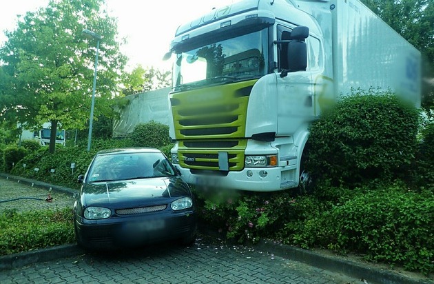 Anschließend rollt der LKW über die Robert-Koch-Straße und schiebt einen am rechten Fahrbahnrand geparkten, unbesetzten PKW über den Bordstein eine Böschung hinab. Der LKW kommt an der Böschung zum Stillstand.