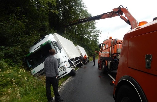 Unfallort: 57537 Wissen, L 278, Hof Hufe Unfallzeit: Montag, 27.07.2015, 10.23 Uhr Der Fahrer eines Lkw mit Anhänger befuhr die L 278 von Morsbach kommend in Richtung Wissen. Nach dem Hof Hufe kam das Gespann in einer Linkskurve nach rechts von der Fahrbahn ab und kippte in der angrenzen Böschung auf die rechte Fahrzeugseite. Für die Bergung des Gliederzuges musste ein großer Bergungskran herangeführt, die L 278 für die Bergung und Straßenreinigung für ca. 3 Stunden voll gesperrt werden.