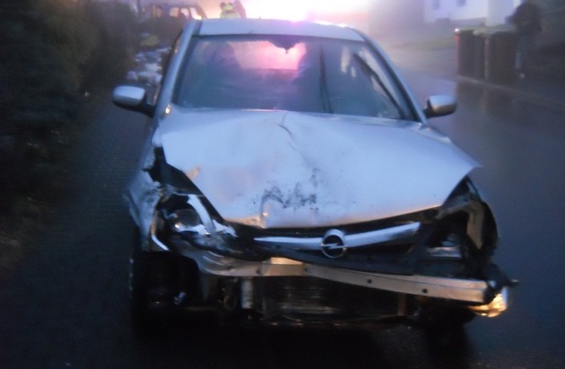 Am Fr., dem 23.03.2018, gegen 05:51 Uhr, befuhr ein 18-jähriger Fahrzeugführer mit seinem Pkw Opel Corsa in Birken-Honigsessen die Hauptstraße aus Richtung Morsbach kommend in Richtung Wissen. In Höhe von Haus Nr. 127 geriet er eigenen Angaben zufolge aufgrund der schlechten Sichtverhältnisse zu weit nach rechts und fuhr auf den ordnungsgemäß geparkten PKW Opel Agila einer 63-jährigen Fahrzeughalterin auf. Durch die Wucht des Aufpralls wurde der PKW Opel Agila noch gegen eine Straßenlaterne gedrückt. Der 18-Jährige erlitt bei dem Anstoß leichte Verletzungen. An den beiden Fahrzeugen entstand Totalschaden.