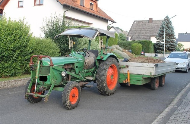 Am Donnerstag, 23.07.2015, 19:10 Uhr, befuhr der 49 jährige Unfallverursacher aus der VG Westerburg mit einem Traktor die leicht abschüssige Straße Kleinfeldchen in Girkenroth. Während der Fahrt befanden sich verbotswidrig zwei Personen auf der Vorderen Bracke eines mitgeführten Anhängers. Während der Fahrt kam es zu einem Bruch eines Sicherungsbolzens an der Deichsel des Anhängers, wodurch dieser gegen das Heck des Traktors geschoben wurde. Während eine Person noch rechtzeitig abspringen konnte, wurde der Fuß des 16 jährigen Sohnes des Verursachers zwischen Traktor und Anhänger eingeklemmt. Der Verletzte wurde vorsorglich mittels Rettungshubschrauber in das BWZK eingeliefert.