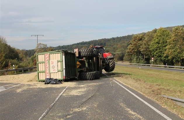 Am 14.10.2016 ereignete sich gegen 11.30 Uhr auf der B414 ein Verkehrsunfall mit bedeutendem Sachschaden und hoher Verkehrsbeeinträchtigung. Ein mit Silage beladenes Traktorengespann befuhr die B414 aus Richtung Norken kommend in Richtung Hachenburg. In Höhe Straßenmeisterei schaukelte sich der Anhänger aus noch nicht geklärter Ursache auf und kippte nach links auf die Gegenfahrbahn um. Dabei kollidierte der Anhänger des Traktors mit einem entgegenkommenden LKW und dessen Anhänger. Beide Fahrzeuge wurden durch die Kollision erheblich beschädigt und die jeweilige Ladung verteilte sich auf der Bundesstraße. Bei dem Versuch der Ladung auszuweichen, wurden noch zwei weitere PKW beschädigt. Die B414 musste für die Bergungs- / Aufräumarbeiten bis ca. 14.00 Uhr komplett gesperrt werden. Durch den Unfall, sowie durch weitere Baustellen in der Umgebung kam es zu erheblichen Verkehrsbeeinträchtigungen. Der entstandene Sachschaden wird auf mehr als 100.000EUR geschätzt. POLIZEIINSPEKTION HACHENBURG - Telefon 02662/9558-0 - E-Mail: pihachenburg@polizei.rlp.de ********************************************************************* ************************************************************