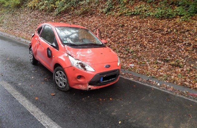Am 07.11.2016, gegen 12:00 Uhr, befuhr eine 23-jährige Autofahrerin die Landesstraße 332 von Nassau in Richtung Schweighausen. Ausgangs einer Rechtskurve verlor sie, vermutlich aufgrund nicht angepasster Geschwindigkeit auf der laubbedeckten und nassen Fahrbahn, die Kontrolle über Ihren PKW und kam nach rechts von der Fahrbahn ab. Der PKW überschlug sich anschließend im Hang neben der Fahrbahn, wurde zurückgewiesen und kam wieder auf den Rädern zum Stehen. Die junge Unfallfahrerin wurde glücklicherweise nur leichtverletzt, ihr Auto jedoch total beschädigt. POLIZEIINSPEKTION BAD EMS - Telefon 02603/970-0 - E-Mail: pibadems@polizei.rlp.de ********************************************************************* ************************************************************