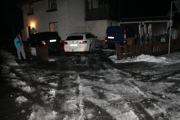 Glück im Unglück hatte ein 46 jähriger Fahrzeugführer, der am Donnerstag, 12.01.2017, 04:20 Uhr, die K 54 von Stahlhofen am Wiesensee nach Hergenroth fuhr. In der Ortslage Hergenroth versuchte er auf spiegelglatter Fahrbahn, sein Fahrzeug zu verlangsamen. Dabei hatte er aber keinerlei Chancen und rutschte nach etwa 80 Meter durch ein offen stehendes Hoftor zwischen zwei abgestellten Pkw hindurch. Anschließend prallte er gegen die dortige Hauswand und verursachte Sachschaden an einer dort abgestellten Sitzgruppe und der Außenfassade. Der Unfallverursacher wurde leicht Verletzt und es entstand ein Gesamtschaden von etwa 6.000,- Euro. Während der Unfallaufnahme mussten sich die eingesetzten Polizeibeamten mehrfach vor heranrutschenden Kraftfahrzeugen in Sicherheit bringen. POLIZEIINSPEKTION WESTERBURG - Telefon 02663/9805-0 - E-Mail: piwesterburg@polizei.rlp.de ********************************************************************* ************************************************************