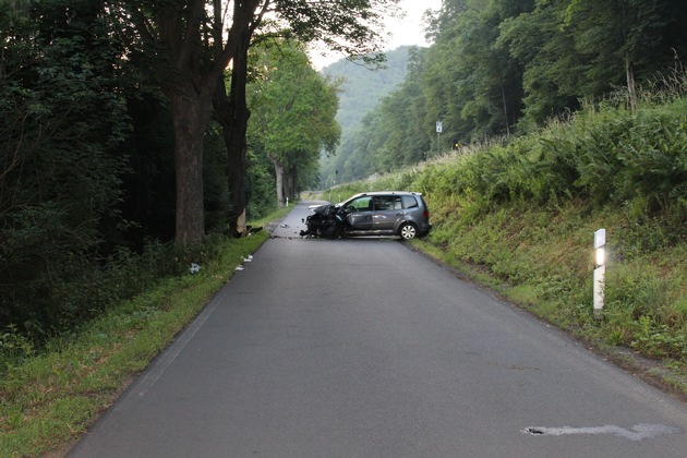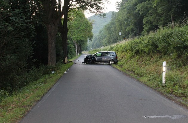 Am Samstag, 24.06.2017, 03.35 Uhr ereignete sich auf der K 66 zwischen Friedrichssegen und Miellen ein Verkehrsunfall bei dem eine Person schwer verletzt wurde . Ermittlungen an der Unfallstelle ergaben, dass der 46-jährige Pkw-Fahrer aufgrund eines Sekundenschlafes nach links von der Fahrbahn abkam und gegen einen Baum prallte. Der Fahrer wurde schwer verletzt in ein Krankenhaus verbracht. Am Pkw entstand Totalschaden.