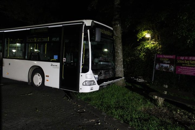 Am Dienstagmorgen, 22.08.17, 02.45 Uhr, versuchten bisher unbekannte Täter einen in Hachenburg auf dem Parkplatz Am Burggarten abgestellten Linienbus zu entwenden. Nachdem sich die Täter Zugang zum Fahrzeug verschafft hatten, versuchten sie mit diesem den Tatort zu verlassen. Hierbei kamen sie jedoch von der Fahrbahn ab, stießen gegen einen Baum und flüchteten. Hinweise erbittet die Polizeiinspektion Hachenburg unter der Rufnummer 02662-9558-0.
