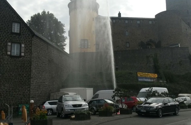 Mayener Burggeysir Der Unachtsamkeit eines Autofahrers hatten am Samstagmittag zahlreiche Besucher des Stein- und Burgfestes in Mayen das Aufsteigen einer Wasserfontäne, ähnlich einem Geysir, zu verdanken. Unmittelbar vor der Genovevaburg, unweit von Markt und Boemundring fuhr der Mann mit seinem Pkw gegen einen Standhydranten, aus dem nach der Kollision eine ca. 20 Meter hohe Wasserfontäne aufstieg. Nachdem circa 20 Kubikmeter Wasser die Burg in einem komplett anderen Licht erschienen ließen, konnte die Zuleitung durch Mitarbeiter des städtischen Wasserwerks abgestellt werden.