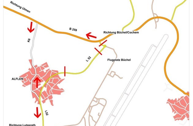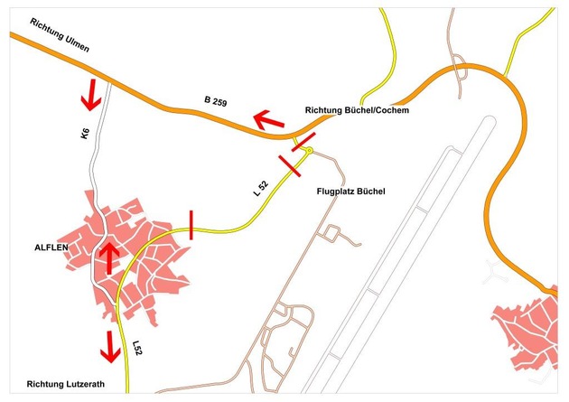 Da es in der Vergangenheit aufgrund von Versammlungen am Fliegerhorst zu teilweise erheblichen Verkehrsstörungen kam, haben Kreisverwaltung Cochem-Zell, Landesbetrieb Mobilität, Polizei Cochem, Bundeswehr und Verbandsgemeinde Ulmen ein Umleitungskonzept erarbeitet. Ziel des Konzeptes ist es, bei Störungen am Haupttor den Durchgangsverkehr möglichst sicherzustellen. Von den Straßenmeistereien wurden die entsprechenden Verkehrszeichen aufgestellt, bzw. aktualisiert. Wenn zu befürchten ist, dass eine Verkehrsstörung im Bereich des Verkehrskreisels am Haupttor des Fliegerhorstes nicht kurzfristig zu beheben ist, wird der Verkehr aus Ulmen in Richtung Lutzerath bereits ab dem Alfler Heiligenhäuschen über die Kreisstraße 6 durch Alflen (Moselweg) auf die L 52 geführt. Aus Lutzerath wird der Verkehr Richtung Ulmen am Ortseingang Alflen nach links auf die K 6 geführt, durch Alflen zur B 259. Aus Richtung Büchel wird der Verkehr in Richtung Lutzerath am Fliegerhorst vorbei über die B 259 ebenfalls zur Einmündung K 6 geführt, von dort durch Alflen (Moselweg) ebenfalls auf die L 52. Aus Richtung Ulmen kommend ist zum Erreichen des Fliegerhorstes ebenfalls die Kreisstraße 6 zu nutzen.