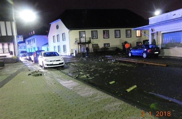 Sinzig-Bad Bodendorf, Hauptstraße Am 03.01.2017, um 06.09 Uhr, wurde durch eine Windhose ein Stalldach abgehoben und auf die mehrere Meter entfernte Hauptstraße geschleudert. Hierbei wurden ca. 14 geparkte Fahrzeuge, eine Photovoltaikanlage und angrenzende Häuser beschädigt. Der Sachschaden wird auf mehrere 10.000 Euro geschätzt. Im Einsatz waren u.a. die Feuerwehr Sinzig-Bad Bodendorf und die Polizeiinspektion Remagen