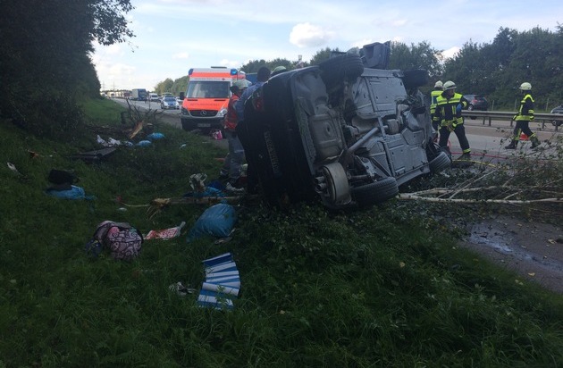 Auf der Seite liegend fing der Motorraum Feuer, welches jedoch durch die eingesetzte Streife und Ersthelfer zeitnah gelöscht werden konnte. Der Fahrzeugführer, sowie die zwei Töchter konnten aus dem seitlich liegenden Fahrzeug befreit werden und wurden lediglich leicht verletzt. Die Ehefrau des Fahrers war so schwer verletzt, dass sie von der Feuerwehr aus dem Fahrzeug befreit werden musste. Um eine schonende Bergung zu gewährleisten, wurde hierzu das komplette Dach aufgeschnitten. Im Anschluss erfolgte die sofortige Verbringung ins Krankenhaus Limburg, wo aufgrund mehrfacher Frakturen eine zeitnahe Not-OP erforderlich wurde. Die Autobahn war im Bereich der Unfallörtlichkeit für ca. 2 Stunden lediglich über 1 Fahrstreifen befahrbar. Daher kam es auch zu einem ca. 10 km langen Rückstau.