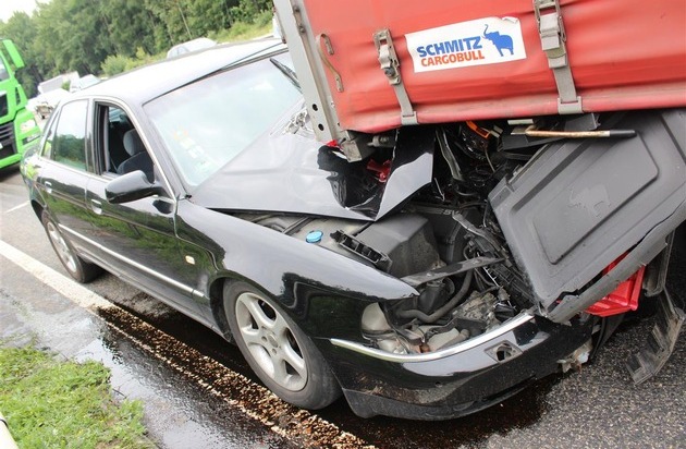Am 13.06.2018 gegen 14:30 Uhr wurde der Polizeiautobahnstation Montabaur ein Verkehrsunfall zwischen einem PKW und einem LKW gemeldet. Der 48 jährige Fahrer des unfallverursachenden PKW ist nach eigenen Angaben eingeschlafen und hat kurz die Kontrolle über seinen PKW verloren. In der Folge ist er dann unter einen auf dem rechten Fahrstreifen fahrenden LKW gefahren. Der PKW wurde erheblich beschädigt. Des Weiteren erleidet die 40 jährige Beifahrerin Schmerzen im Bauch Bereich. Sie wurde vorsorglich ins Krankenhaus verbracht. Die BAB 3 Höhe der Ausfahrt Dierdorf war für kurze Zeit voll und für 2 1/2 Stunden der rechte Fahrstreifen gesperrt. Hierbei kam es zu kurzfristigen Stauungen. Die Aufräumarbeiten, insbesondere das Binden von auslaufenden Betriebsstoffen, wurde durch die Autobahnmeisterei Ammerich durchgeführt.