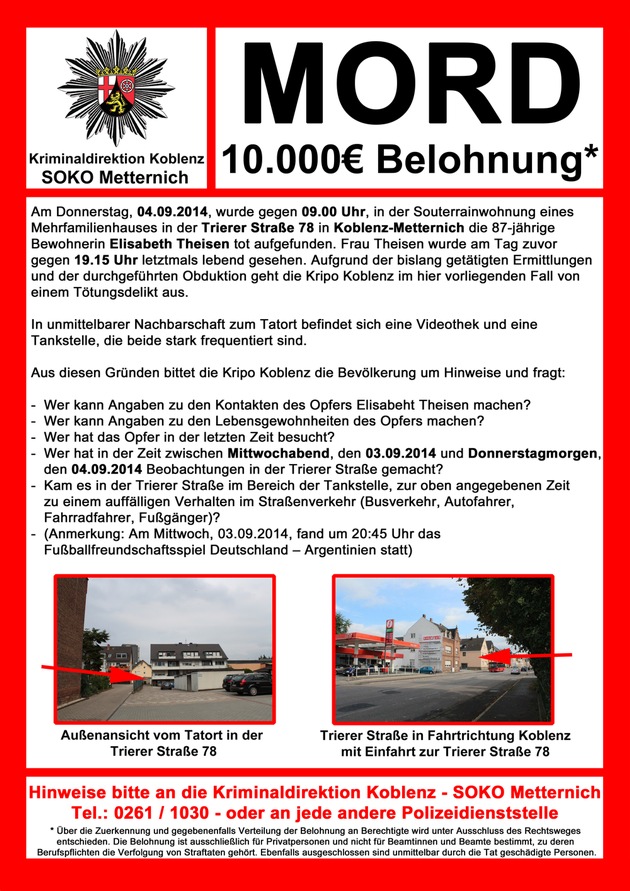 Nach wie vor ungeklärt ist das Tötungsdelikt an einer 87 Jahre alten Seniorin aus Koblenz-Metternich, die am Donnerstag, 4. September 2014, gegen 9.00 Uhr, tot in der Souterrainwohnung eines Mehrfamilienhauses in der Trierer Straße 78 in Koblenz aufgefunden worden war. Die Polizei hatte seinerzeit die Sonderkommission "Metternich" gegründet und arbeitete in Zusammenarbeit mit der Staatsanwaltschaft Koblenz monatelang intensiv an der Aufklärung des Verbrechens. Leider bis heute, ohne den entscheidenden Durchbruch zu erzielen. Die wenigen, aus der Bevölkerung eingegangenen Hinweise führten bislang nicht zum Erfolg. Anlässlich des Jahrestag dieses Verbrechens wenden die Ermittlungsbehörden sich aus diesem Grund heute noch einmal an die Öffentlichkeit, um vielleicht doch noch den entscheidenden Hinweis zu erlangen. Dabei kann jede noch so als unwichtig erscheinende Beobachtung den Ermittlern helfen: