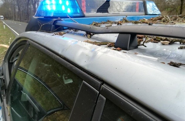 Am Donnerstag, 18.01.2018, 12.10 Uhr, wurden Beamte der Polizeiwache Wissen zu einer Verkehrsbeeinträchtigung durch Windbruch auf der B 62 gerufen. Während der Absicherung in der Gemarkung Hövels schlug unmittelbar hinter dem Streifenwagen, in dem sich ein Beamter befand, ein umgestürzter Baum auf. Der Pkw wurde von der Baumkrone vollständig getroffen und darunter begraben. Der im Fahrzeug befindliche Beamte blieb unverletzt und konnte sich eigenständig aus dem Fahrzeug befreien. Am Streifenwagen entstand erheblicher Sachschaden.