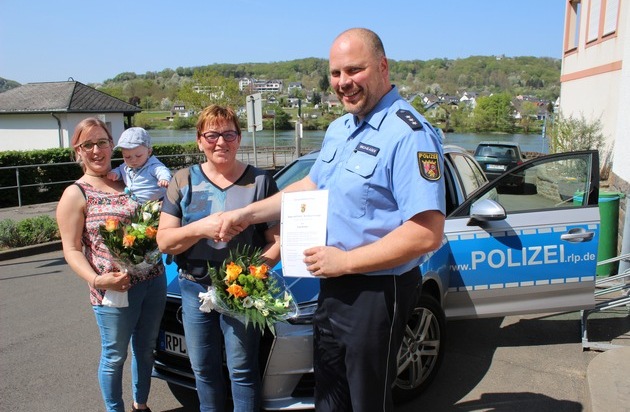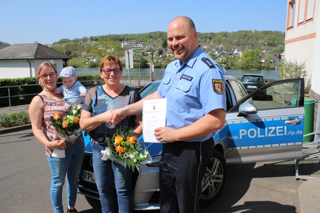 Polizeihauptkommissar Andreas Wich-Glasen, Leiter der Polizeiwache Brodenbach, lobte den Einsatz der Helferinnen und bedankte sich mit einem Blumenstrauß bei den Moselanerinnen. "Sie haben Zivilcourage gezeigt. Sie haben nicht weggeschaut, sondern sich in bespielgebender Weise für einen anderen Menschen eingesetzt. Hierfür spreche ich Ihnen persönlich und im Namen der Polizei Rheinland-Pfalz meinen besonderen Dank aus", so die Worte des Polizeipräsidenten Karlheinz Maron in der überreichten Bürgerurkunde.
