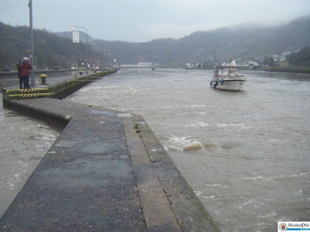 Bereits am Freitag, den 15.12.2017 gegen 17:40 Uhr kam es im Bereich der Schleuse Aldegund auf der Mosel zu einem Sportbootunfall. Aufgrund fehlender Ortskenntnis bei einsetzender Dunkelheit steuerte ein talfahrendes 12m langes Sportboot oberhalb der Schleuse versehentlich an der Schleuseneinfahrt vorbei und fuhr in Richtung des Schleusenwehrs. Durch Auswerfen des Ankers, welcher sich glücklicherweise in der Nothaltekette vor dem Wehr verfing, konnte ein Abtreiben des Bootes über das Wehr verhindert werden. Aufgrund der dort herrschenden starken Strömung konnte das mit 2 Mann besetzte Sportboot diesen Bereich nicht mehr selbstständig verlassen. Die über Notruf herbeigerufene Feuerwehr konnte mittels weiteren Tauen das Boot sichern und die Bootsbesatzung retten. Aufgrund des derzeit hohen Wasserstandes der Mosel wird mit der Bergung des Sportbootes so lange gewartet, bis der hohe Wasserstand und alle hiermit verbundenen Risiken deutlich nachgelassen haben.