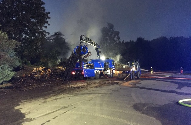 FW-RE: Brennender Holzstapel beschäftigt Feuerwehr stundenlang