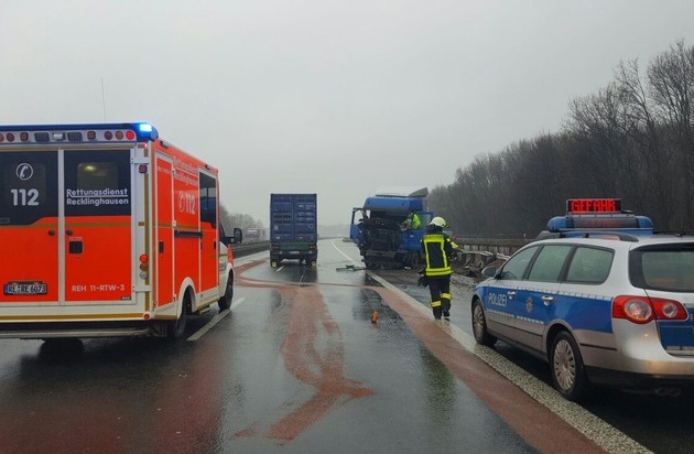 Am Vormittag des 11. Januar 2017 kam es um 10:30 Uhr zu einem Verkehrsunfall mit einem Lastkraftwagen (LKW) auf der Bundesautobahn BAB 43 auf Recklinghäuser Stadtgebiet. Bei dem Verkehrsunfall blieben alle Unfallbeteiligten unverletzt.