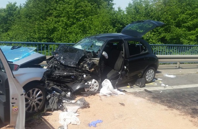 Am Unfallort waren zwei PKW frontal ineinander gefahren und schwer verunfallt. Ein dritter PKW war außerdem noch in den Unfallhergang verwickelt. Eine Person war beim Eintreffen der Einsatzkräfte im Fahrzeug eingeklemmt und musste mit schwerem technischen Gerät aus der Karosserie befreit werden.