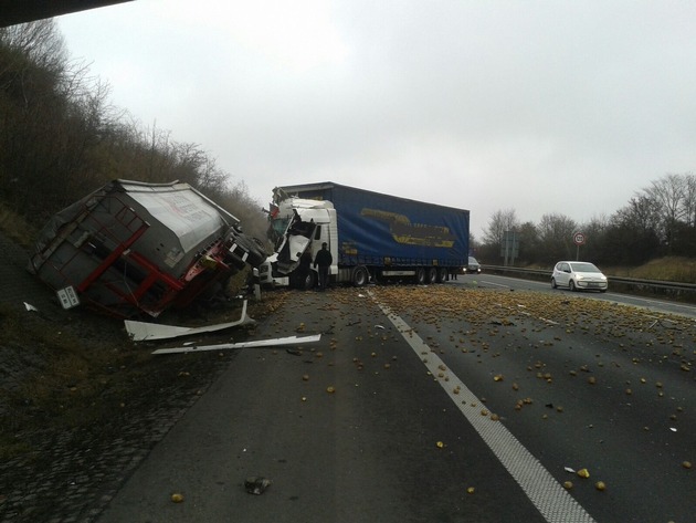 HANN. MÜNDEN (jan) - Am Montag (06.02.2017) gegen 15.00 Uhr kam es auf der A 7 zwischen dem AD Drammetal und der AS Hann. Münden/Hedemünden zu einem Auffahrunfall bei dem zwei Lkw beteiligt waren. Nach ersten Informationen befuhr ein 51 Jahre alter ukrainischer Fahrer mit seinem Sattelzug die A 7 in Richtung Kassel. Aus noch ungeklärter Ursache stieß er auf dem Hauptfahrstreifen auf den verkehrsbedingt vor ihm haltenden Lkw und kam quer zur Fahrtrichtung auf dem Haupt- und Mittelfahrstreifen zum Stehen. Durch die Wucht des Aufpralls wurde der Auflieger des vorderen Lkw abgerissen und die Ladung mit Kartoffeln verteilte sich über die Fahrbahn. Der 51-jährige Fahrer aus dem Landkreis Goslar wurde nicht verletzt. Der ukrainische Brummifahrer konnte von der Feuerwehr aus seinem Fahrzeug verletzt befreit werden. Er kam anschließend mit einem Rettungswagen in ein Göttinger Krankenhaus.