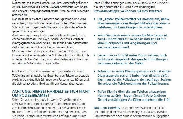 Sinnvolle Tipps, wie man sich vor dieser Betrugsmasche schützen kann, enthält das Infoblatt "Warnung vor falschen Polizeibeamten" im Anhang.
