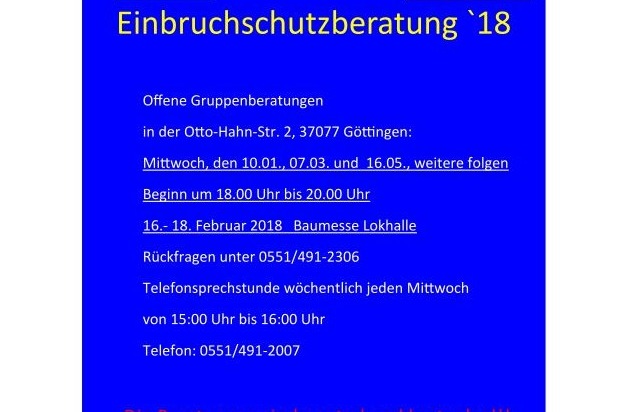 POL-GÖ: (7/2018) Polizeiinspektion Göttingen setzt "Beratungsoffensive für wirksamen Einbruchschutz" fort - Erste Infoveranstaltung 2018 am 10. Januar in Göttingen, Anmeldung nicht erforderlich!